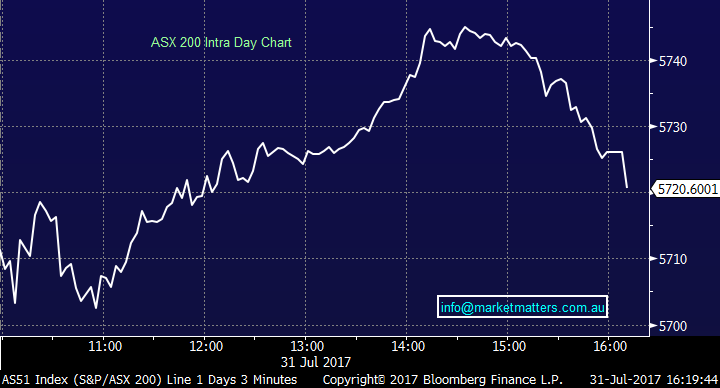 Obviously the Material sector led the charge adding +1.52% and interestingly, the 3 stocks mentioned above accounted for ~11 index points or +64% of today’s gains, while most pain was felt amongst the Real Estate names followed closely by Healthcare and the Telcos – all sectors Market Matters are giving a wide berth at the moment. Overall we had a range of +/- 44 points, a high of 5745, a low of 5701 and a close of 5720, up +17pts or +0.31%.