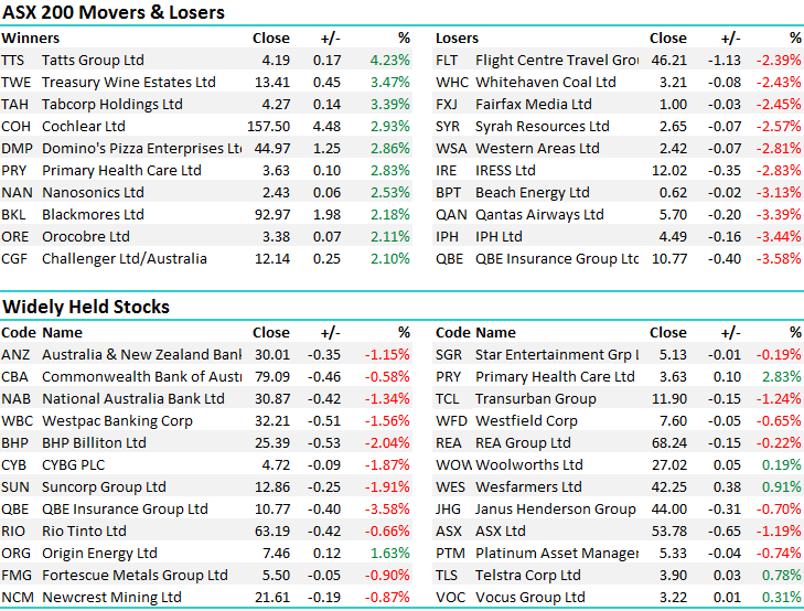In terms of companies to report this week, overall it’s been positive however with some BIG ranges post results. A few that stuck out in terms of trading ranges are highlighted below. The standouts on the upside were Bendigo, Origin, Cochlear, and Tatts, while on the downside we saw big reactions in Challenger Group Financial (CGF), Telstra (TLS) & QBE