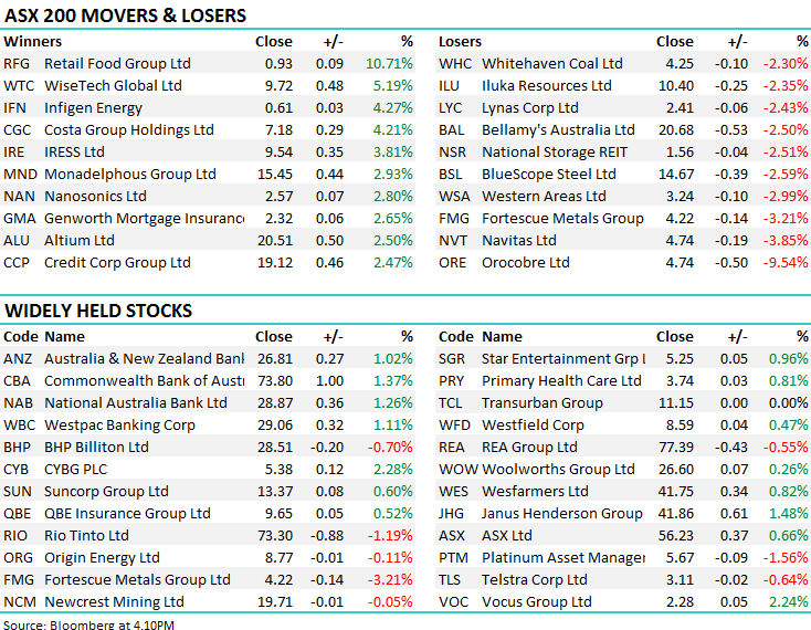 Iron Ore was weaker overnight and down again in Asian trade today by another -2.30% which prompted more selling in Fortescue (FMG) which lost -3.21% to $4.22 - a new 12 month low for the stock, while RIO also finished in the red. Today was really a day of bank buying rather than bank bashing and as we suggested yesterday afternoon – the sector simply felt susceptible to a move higher on less / no more bad news – sellers have simply dried up here in the short term and we think CBA has $77.50 written all over it!