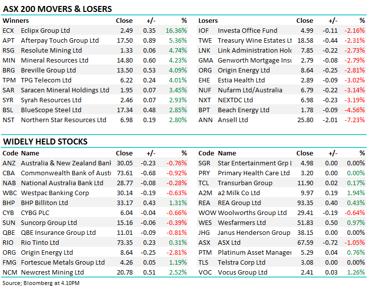 A fairly lethargic day on the index front however reporting season threw up a few curlies at the stock level. HUB24 (HUB) produced a good set of results and announced their madden dividend, the stock up +9.05% on the session while on the flipside, Ansell (ANN), a stock we’re keen on into weakness fell by 7.23% after missing expectations by 4.9% at the profit line and was more downbeat about FY19 guidance than the market was. Elsewhere, Fortescue (FMG) was a slightly confused result on first read through and that ensured the stock was volatile throughout the session, however as calmer heads prevailed, the Iron Ore miner edged higher into the close, While Woolworths (WOW) was down early, but recovered from the lows to close out the day down -0.64% at $29.41. More on these results below.