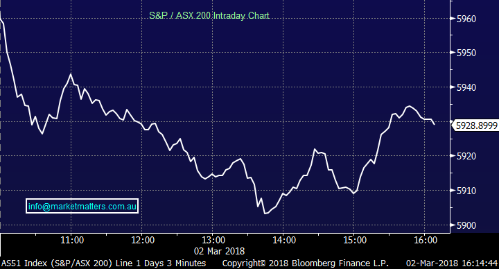 Weakness in the US market overnight courtesy of Trumps ‘protectionist’ comments flowed through into Asian trade today with the region suffering its 3rd straight session of losses. The local bourse is now down -155pts/ 2.5% from the weekly high. That said, there was reasonable buying from the lows today, mainly supported by the banks which is very typical of this time of year. We’ve maintained our short term bullish stance with the caveat that the 5900 level needs to hold on the ASX 200, and today it did with a low of 5902 before the mkt rallied +26pts into the close. US Futures were trading flat around our closing bell while Iron Ore lost ~1% during Asian trade.