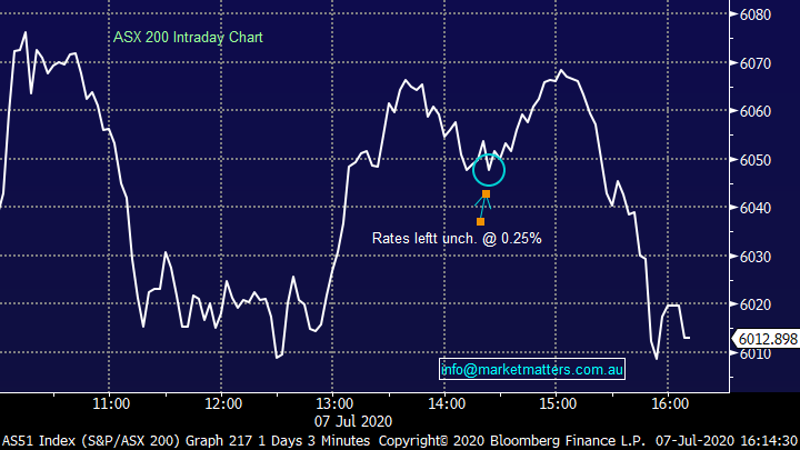 The RBA met this afternoon and kept rates on hold at 0.25% which was expected, they talked about the economic (and health outcomes) being better than expected thus far, flagging that the fall in hours worked in May was smaller than anticipated which suggests their forecast for a 10% contraction in the first half will prove too bearish. That said, they stressed the outlook remains uncertain, and the recent spike in cases in Victoria (and reimposition of restrictions in response) clearly highlights this.