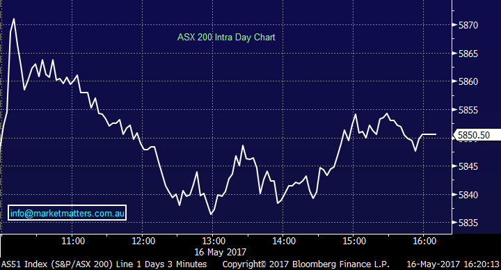 A higher open this morning despite both NAB and Macquarie trading ex-dividend before some lethargic mid-morning profit taking crept in again pushing the index a long way off the session highs…We had a range today of +/- 36 points, a high of 5871, a low of 5835 and a close of 5850, up +12pts or +0.21%,
