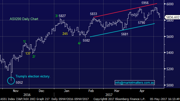 Another day of selling for the ASX with the market now down -121pts from the 1st May high of 5956 to close today at 5836 – a drop of around 2% but hardly cause for concern just yet. We had a range today of +/- 58 points, a high of 5885, a low of 5827 and a close of 5836, down -40pts or -0.68%.