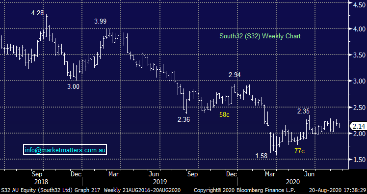 South32 (S32) -0.47%: full year result was pretty poor vs last year but reasonable to what the market was after. EBIT was down nearly 70% but landed around 4% ahead of the market, they paid a 1USc dividend and extended the current buyback by 12 months – it has been paused but they plan to “re-commence the program as COVID-19 related operational risks subside and our financial performance improves.” The presentation wasn’t overly bullish with the company focussing on cost cutting to protect against volatile pricing. They are in the midst of offloading a number of assets. This looks to be near to the lows for the main commodities S32 deals in – we like it.
