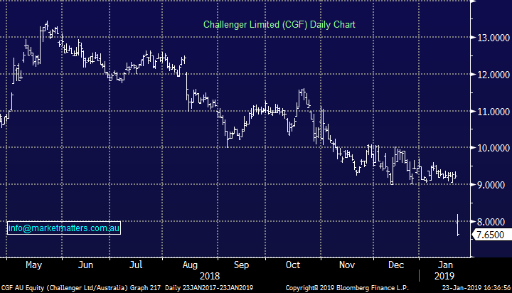 Challenger (ASX: CGF) $7.65 / -17.12%; tumbled this morning on the back of management lowering guidance for the upcoming half year result and also for the FY19 due out later this year. Now expecting a pre-tax profit of $270m for the half year, and between $545m and $565m in the full year, the updated guidance suggests growth of 0-3%, well below previous guidance of 8-12% growth. The new figure is also ~6% below the consensus figures for the year end.