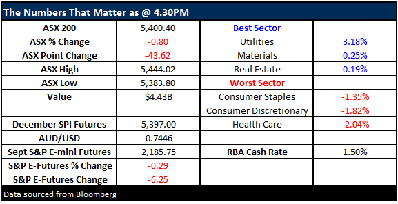 We had a range today of +/- 60 points, a high of 5444, a low of 5384 and a close of 5403, off -43pts or -0.80%. Volume was still weak – about 20% below the 20 day average…Energy was sold early but recovered – Crude Oil down a tad in Asian trade BUT Iron Ore was up around 4% at time of writing.