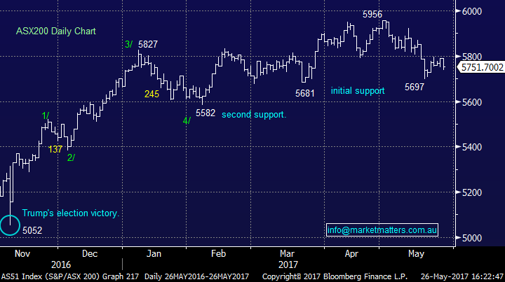 Unfortunately the Australian market feels in the “glass is half empty mode”, as it ignores positive leads from overseas and when they dare to fall, like some of Asia today, we simply get belted. The May-June seasonal weakness continues to play out as we anticipated with our 5600 target area now only ~2.5% away.