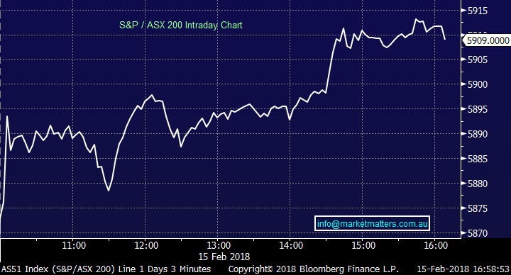 It seems the reflation trade is alive and well and it was those reflation stocks that did best in today’s trade. Resources led the +1.16% bounce that played out with the ASX putting on 68pts to close at 5909 – our 5950 shorter term target is now very much in play. We used the recent weakness as a buying opportunity which is always a challenge at the time however, we’re not resting on our laurels.