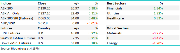 Overall, the ASX 200 added +27pts / +0.38% today to close at 7130. Dow Futures are trading up +57pts/+0.20%