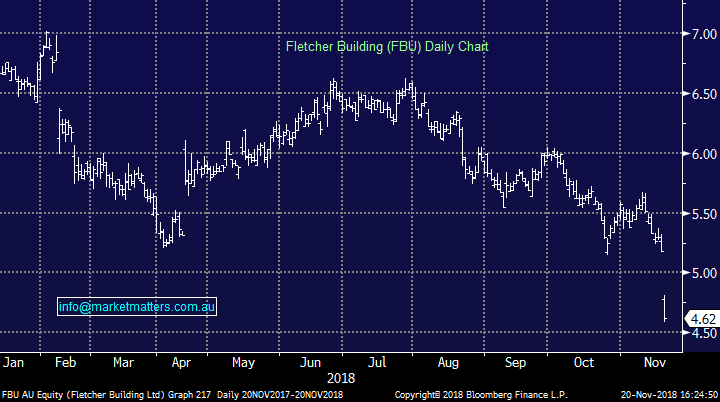 Fletcher Building (ASX: FBU) $4.62 / -10.81%; The building materials manufacturer was the worst performing company on the index today after the company released disappointing FY19 guidance before the market opened, continuing the recent weak commentary coming from a number of construction leveraged names. Guidance for full year EBIT (before one off charges) was $630m - $680m, with the top end below the consensus estimate of $692m.