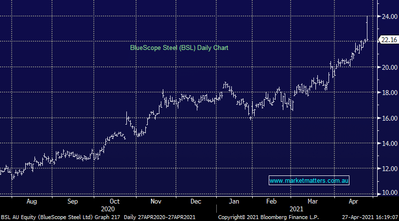 BlueScope also manufacture a hot rolled coil (HRC) product, used to make a variety of other goods, which has seen a sharp rise in prices helping boost margins and the earnings outlook with manufacturing seeing swift growth out of CVOID slowdowns. Despite a stronger AUD weighing on earnings, the end result is a pretty strong beat by BSL today, however the stock closed little changed, giving up early strength. A number of analysts had been talking up BlueScope’s chances for beating expectations, the latest was Macquarie just a fortnight ago so the upgrade was largely baked in.