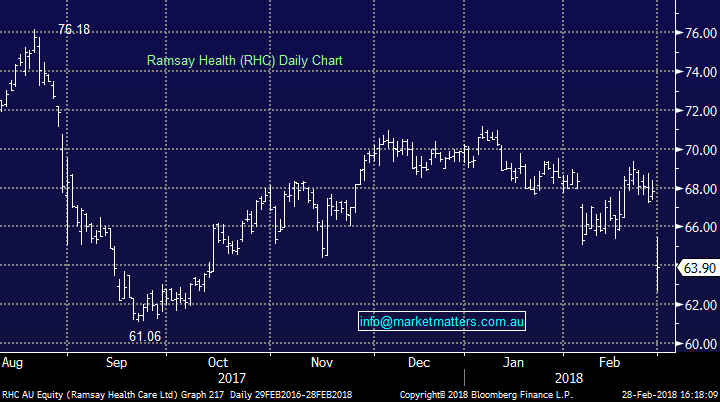 2. Ramsay Healthcare (RHC) $63.90 / -5.75%; Obviously a high quality company although in our view, they trade lower from here even after such a big drop in share price today. The results in all were miss on the numbers and you simply can’t miss when you’re priced at such a lofty valuation – although in fairness, it has come down in recent times. Revenue missed, $4.4bn v $4.5bn expected, profit missed slightly, the trends in the domestic business are weakening (ditto for HSO) and they are undergoing a big re-structure of their French operation. There are clear positive long term drivers for this stock / aging populations / Govt’s supportive of private funding mechanisms, however it seems the short term outlook is less clear / positive and the stocks may struggle here. We are targeting $55 on the downside .