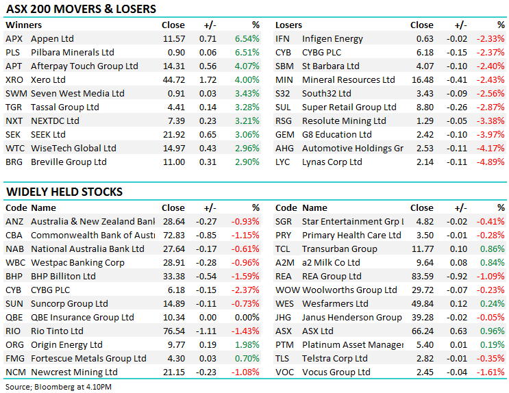 On the flipside, the bigger market weights of materials and financials dragged the market lower. After seeing some support early, the big names rolled over and sent the index into the red. CBA was up over 0.5% early, only to close -1.15%, while BHP was flat in the morning but seen -1.59% lower on the close.