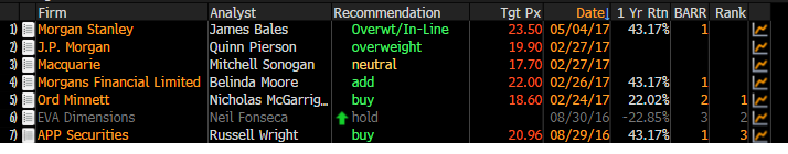 Today though, both stocks did exceptionally well and we’re seeing money flow strongly into the sector. Most analysts a more bearish on FLT given they’re string of recent downgrades however it seems the transformation strategy that is now underway is yielding results, and we’re seeing a more positive stance taken by the market. FLT sort of reminds us of QBE in a way. Historically a very well regarded business that hit a snag, had some industry dynamics work against it in terms of pricing, online competition etc and probably had it too good for too long. They were forced to re-asses and have now taken their medicine and are better for it. The question of whether or not bricks and mortar retailing of travel services is in structural decline or it’s simply cyclical does little to help here. More relevant might be the question around how FLT is integrating bricks and mortar with online channels and how such a model can yield results. Today’s presentation at the Macquarie conference seemed to address this. One to watch.
