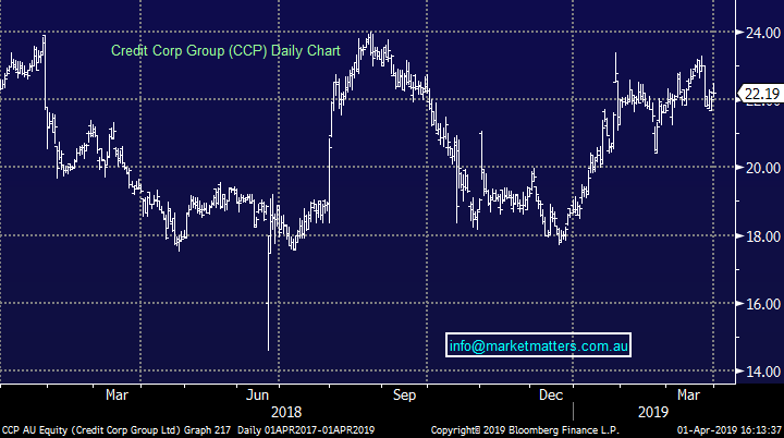 Credit Corp (CCP), unchanged today as it remained in a trading halt for the session. The debt collection company has announced it is launching a capital raise for around $110m to accelerate its debt buying plans this year while also maintaining balance sheet flexibility by reducing gearing to ~20%. The deal will be done at $20.45, ~7% discount to the last traded price on Friday. We spoke about Credit Corp recently, saying the business continues to operate strongly and we weren’t overly concerned about the Chairman selling a $700k parcel of shares and maintain that view.