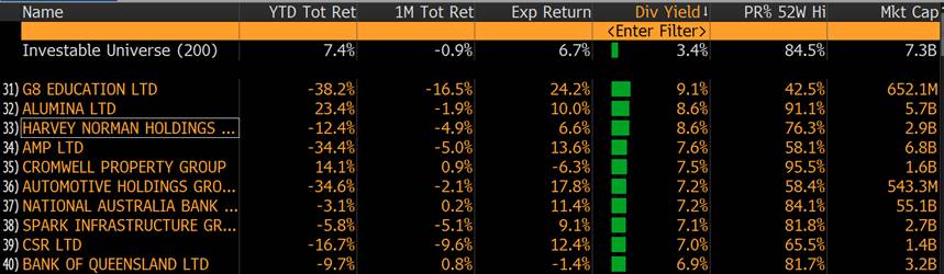 Top 10 Yield – in terms of forecasted dividend yield from here. Dividend traps include G8 & AMP