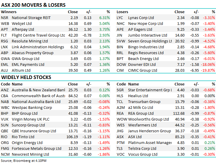 At a sector level today, the IT names were best on ground closing higher on the session as did the REITS following a takeover offer for National Storage (NSR) while on the flipside, Cimic (CIM) and Downer (DOW) were crunched, Harry covers below. Just in terms of NSR, while we don’t own the stock, we do own Abacus (ABP) and the bid should re-focus attention on the value of their storage assets, which seem terribly undervalued basis todays non-bonding proposal from US based Gaw Capital Partners.