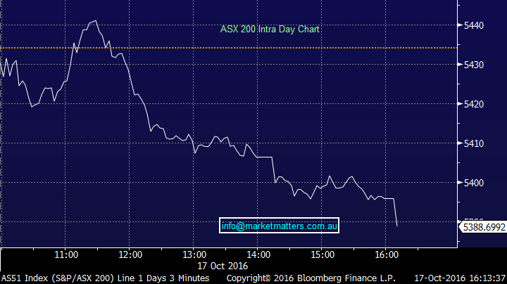 Stand up - stand up….but no one did today and the market sold off on low volume with the index trading at its highest point around 11.30am before a slow and steady grind lower into the close – with the index finishing on its lows. We had a range today of +/- 53 points, a high of 5441, a low of 5388 and a close of 5388, off -45pts or -0.83%. Volume was weak today which is to be expected given we have a raft of Chinese data out on Wednesday + some reasonable prints from the US as well.