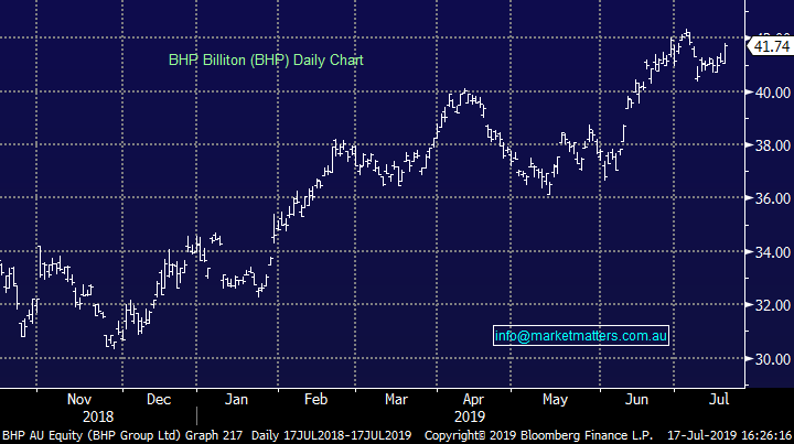 On the costs side of things, BHP broadly hit expectations with the slight exception of the their NSW Thermal Coal which was raised on some production issues. The report also noted a number of one-off costs will be absorbed in the full year result due out next month. These mostly stem from redundancy payments and the Samarco rehabilitation. Despite this, BHP are poised to report a stellar profit at the result given the tailwind of significantly higher iron ore price in the back half of the year. We like BHP, and other iron ore names, into pullbacks, initially targeting $38 as an entry point.