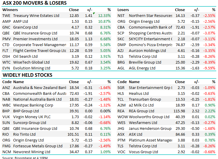 Treasury Wine Estates (TWE) +12.33%: about as inline as a result can be – for FY20 profit was $315.8m vs the market at $315.7m (although it was pre-guided), down 25% on last year with all geographies posting a fall in earnings but the Americas feeling it the most. While the US trade had deteriorated in the first half, COVID was clearly the main driver of declining profit which bodes well for the rebound. The company continues to remain cautious which is unsurprising, however it did note that signs of recovery had started to show in sales. Key to that will be a return to growth in the US as Asia looks to have put the worst conditions behind it.