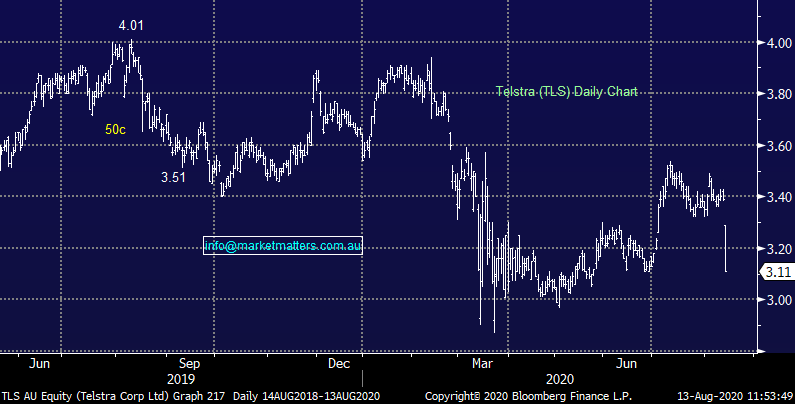 Telstra (TLS) -8.26%: We’ll call it a mixed result although the market clearly didn’t like it. The pro was the dividend being maintained – some thought it would be cut while it seems TLS now have more clarity around what the future holds for them. Earnings for FY20 were a tad weak, the market was looking for profit above $1.91bn and they came in at $1.84bn, plus FY21 guidance was about 8% below expectations, however digital transformation is a topic that will only grow legs as companies move to support a more remote workforce, I can’t help but think TLS is well positioned to take advantage of that. Let’s see how the dust settles, however TLS now a stock back on MM’s radar.