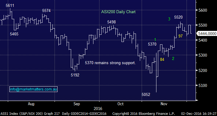 As we wrote this morning, we remain bullish the ASX200 into 2017 but seasonally we are entering a poor 2 weeks for stocks, hence we would be patient with any buying for a potential Christmas rally. On the market today we has a range of +/- 56 points, a high of 5,500, a close on its low of 5,444, off -56pts or -1%.