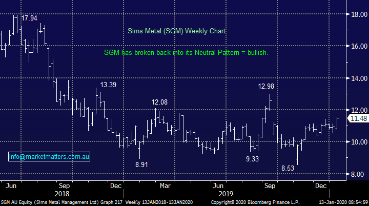 As global growth hits a sweet spot in 2020 relative to current interest rate settings, scrap metal business Sims (SGM) can rally strongly from a low base. 2019 was clearly a tough year for the business with trade tensions putting pressure on scrap prices however we are becoming more optimistic on SGM at this juncture. This is the sort of stock that could do very well in the year ahead.