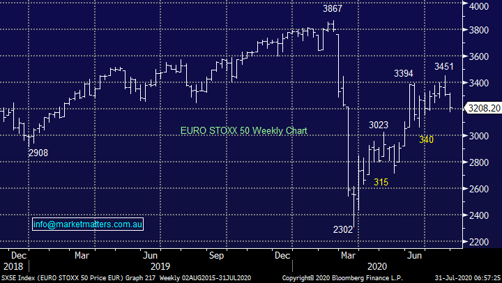 Conversely, European Indices appear to be already correcting their 50% rally from Marchs low, we are buyers of weakness but ideally closer to the 3000 area or ~6% lower – remember the ASX is more correlated to Europe than the US.