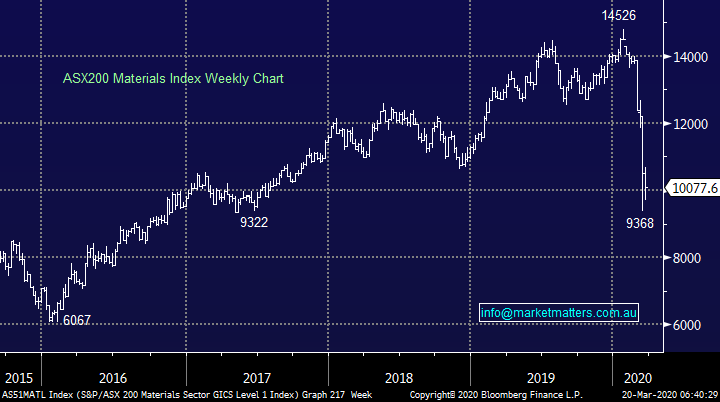 The Material sector is dominated by the resources companies, but it also includes stocks like Bluescope (BSL), Boral (BLD) & packaging company Orora (ORA). The sector has been sold off aggressively as the global economy grinds to a halt but it should be a beneficiary of the huge stimulus tailwind with “cash cows” like BHP (BHP) and Fortescue (FMG) looking particularly attractive.
