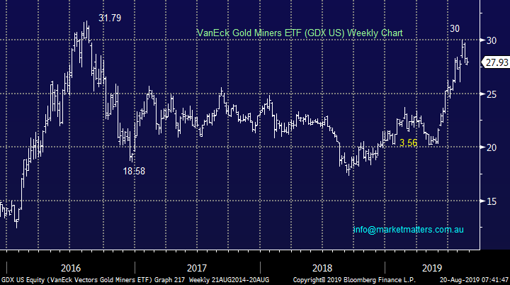 The gold sector has been correcting nicely since we recently took profit on our Newcrest (NCM) and GDX (GDX AU) ETF positions, we intend to re-establish our exposure to the precious metal into this pullback. While there is no deviation from our previously outlined plans it’s important that MM subscribers clearly comprehend our likely investments in the coming days / weeks. Our favourite 4 on the shopping list at this point in time are: