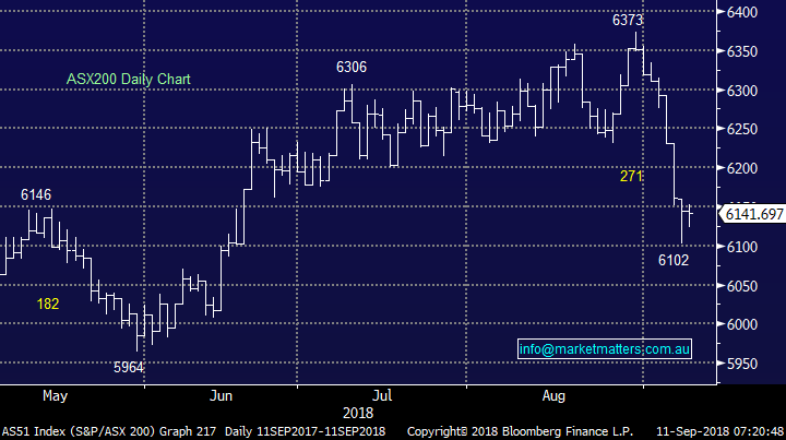 The ASX200 has fallen 271-points in an aggressive manor from its high on the 30th of August. From a technical perspective yesterday’s small bounce on low volume is synonymous with a market consolidating prior to further declines, time will obviously tell but in our opinion the more time spent below 6200 the greater the chance of another leg lower. For our downside target area to be achieved we are likely to need to see some weakness to finally materialise from US stocks but that’s certainly not unfolding at this stage.