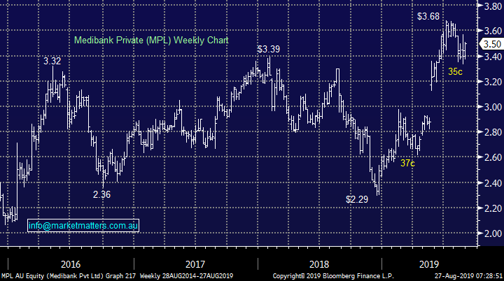 Private health stock MPL has been a quiet achiever in 2019 and it now sits only 5% below its all-time high. Both Medibank and NIB have enjoyed stellar runs after the surprise Coalition victory however we believe MPL is rapidly becoming fully priced – the recent sharp 17% correction by NHF is a potential warning signal.