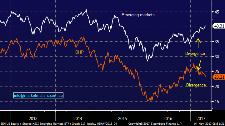 We’ve also included the below chart recently which tracks BHP share price versus the emerging markets. For the first time in years we are seeing some clear divergence between BHP and the Emerging Markets Index, we believe this will come back into line in the coming months with BHP rallying.