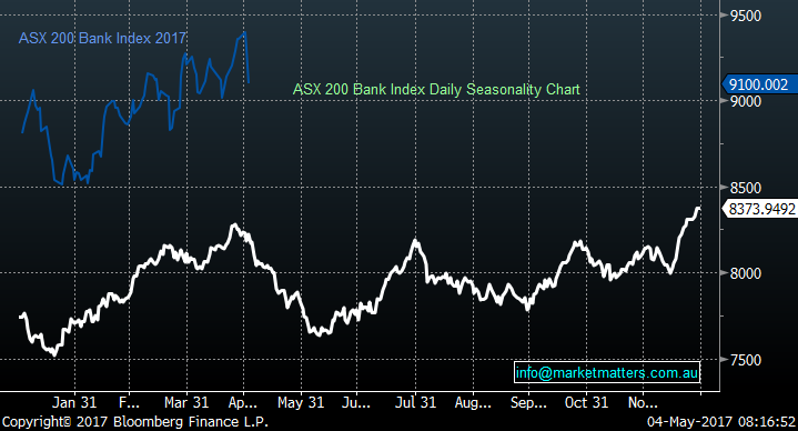 Given yesterday’s price action and in particular, the weakness in BHP which is likely to be extended this morning, we ask ourselves the obvious question of whether or not we remain comfortable in the sector? For now we are however believe it’s an area to be very selective within. From a seasonal perspective, the start of May is often weak as the miners get caught up in the ‘general market weakness’ however by the end of May buying usually comes back in, and the overall performance is generally slightly positive. Iron Ore is obviously a big influence and now looks likely to trade in a range between $60 / $80 for the foreseeable future and we remain overall neutral Iron Ore. If that range plays out, the mid-point is $70 which is around about where consensus sits for the Iron Ore price. Iron Ore is obviously volatile however if it ticks around this level the earnings expectations for the miners will hold firm and the gap between earnings and the share price will close. If BHP delivers the earnings that the market expects it to, then it should trade closer to $28.