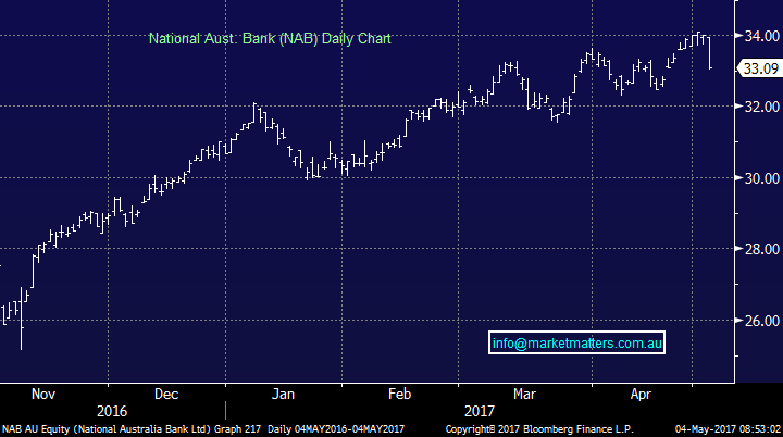 We also hold a smaller position in NAB which reported this morning, and the numbers look reasonable. Stripping out all the noise, cash earnings have come in around +1% above consensus while earnings per share are about a 2% beat however the net interest margin was again a tad soft, at 1.82% v expectations of 1.84%. NAB also reported a very strong capital position similar to ANZ on Tuesday. Leading into this result, there was some concern around the dividend however NAB have maintained 99cps for the half. They go ex-dividend on the 16th May.