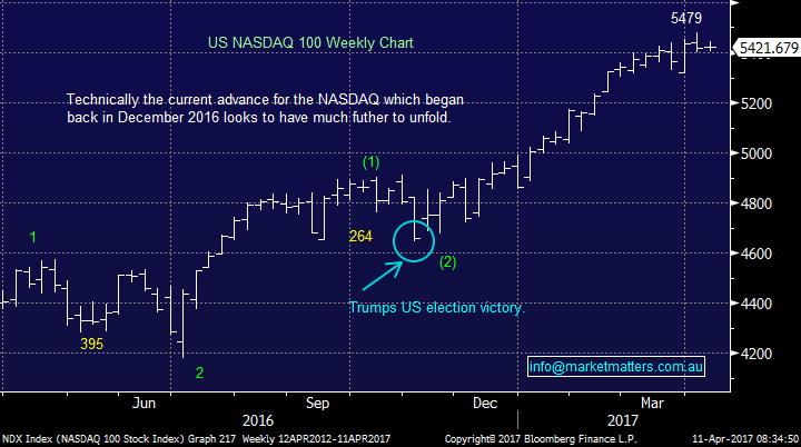 At Market Matters, we remain committed to our view of a rally well over 6000 for the ASX200 in 2017/18 and the toughest question at present is - will the market experience weakness in May / June, to coincide with the usual market seasonal gyrations? At this point in time, we still feel the local market will follow the medium term path illustrated by the arrows in the following monthly chart, but remain open minded as the current bull market unfolds.