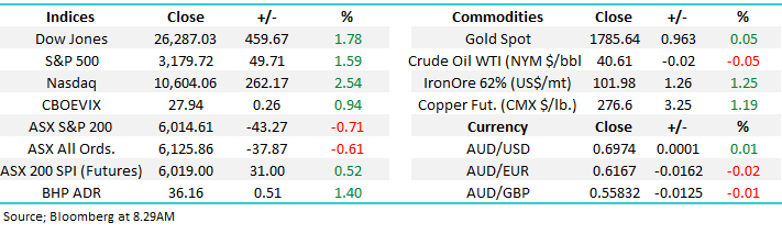 Overnight US stocks were strong led by technology shares pushing the NASDAQ up 2.54%, while the S&P 500 added 1.59%.