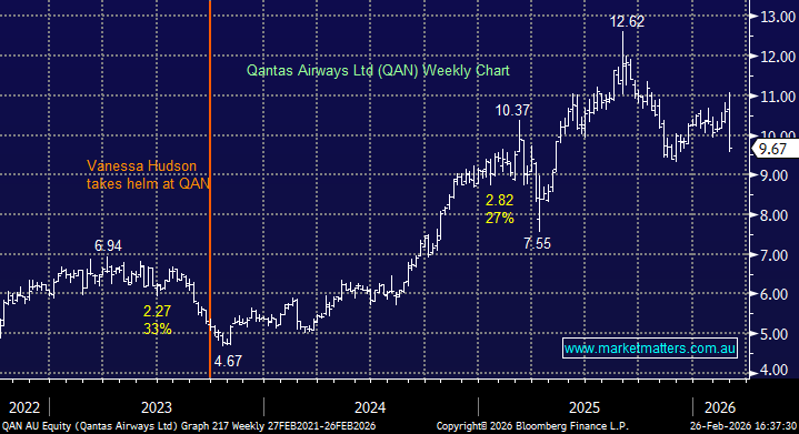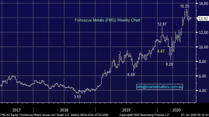 FMG has had a chequered history swinging from profit to loss historically, but otherwise is afforded a low fair value PE south of 10x. FMG’s resilience during COVID-19 was heroic and while we are fans of this major iron ore miner and are bullish materials / resources in the next 1-2 years, after such a stellar run by both the stock and bulk commodity we feel more comfortable adopting a patient approach looking for some better risk / reward, particularly given we have large positions in RIO & BHP.