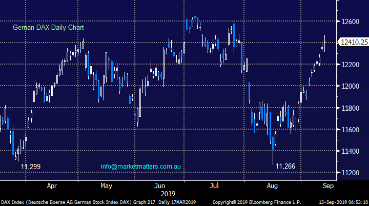 Overnight global stocks were firm enjoying continued optimism around US – China trade and another interest rate cut by the European Central Bank (ECB) to minus -0.5% plus it announced another round of QE through the purchase of bonds - The same old story but when will Europe finally show some green shoots of recovery. The SPI futures are pointing to an open up over 20-points with BHP and the resources sector looking poised for further gains.