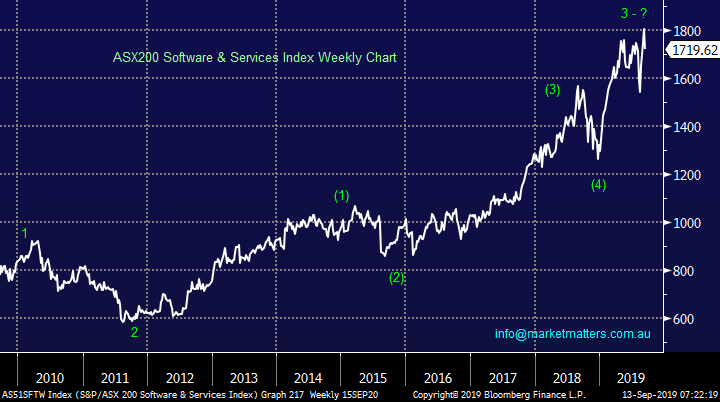 At MM we feel the last 2 have almost finished delivering for the sector hence we pose the question, “is it time to take some $$ from the table?”. This time last year the sector was approaching its greatest sell-off in over a decade as investors and momentum traders alike dumped the high valuation / growth stocks, we put the possibility of a repeat performance at ~25% i.e. technically the sector looks very vulnerable to a retest of Q4 lows, now a significant +20% away.