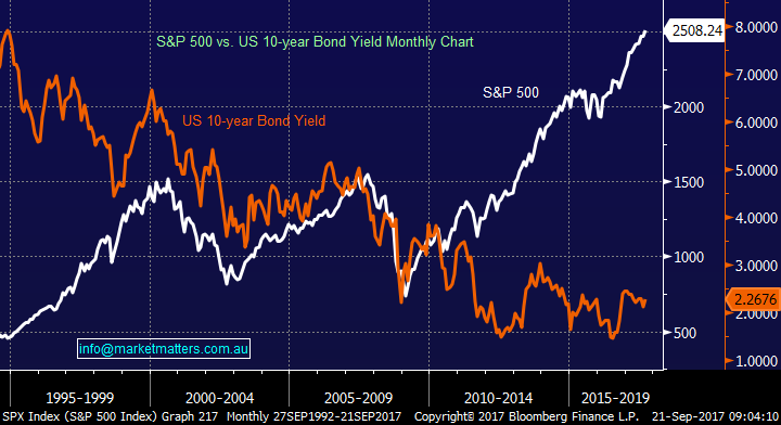 The S&P500 has rallied significantly since the mid-1990’s while global bond yields have fallen e.g. US 10-years from around 8% to under 1.5% last year. There is likely to be an “uncle” point where higher interest rates e.g. term deposits offer a decent alternative for investors to the share market.