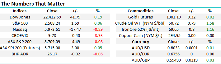 Yesterday, the ASX200 closed marginally lower after being smacked around 50-points in the first 40-minutes of trade. It’s hard to get a handle on this characteristic which is regularly hitting the local market in the mornings, but the early selling is focused on the futures market, hence someone / people are selling the whole ASX200 as opposed to one particular sector – our best “guess” would be a hedge fund (s) are picking our index to continue with its underperformance relative to its peers. The ASX200 is up +0.8% in 2017 compared to the Dow up +13.4%.
