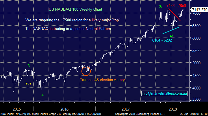 No change, we remain mildly bullish overseas indices targeting fresh 2018 highs for many, the US tech based NASDAQ looks likely to achieve this milestone this week.