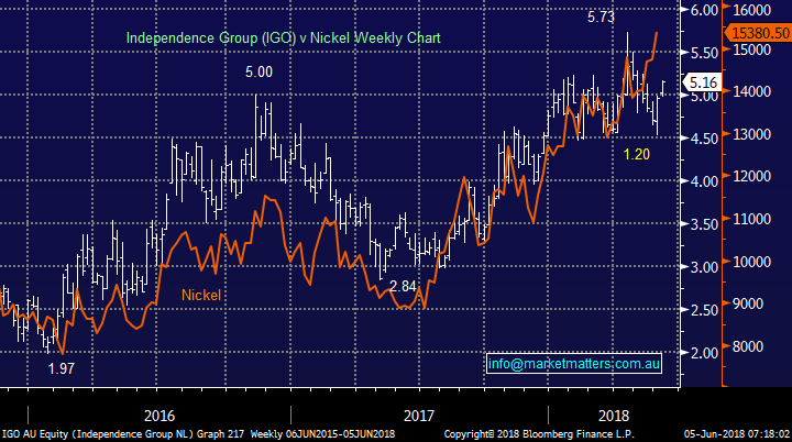 We currently believe these traders are likely becoming uncomfortable as the nickel price continues to rise. The chart below illustrates how IGO is clearly / understandably very correlated to the nickel price which keeps rising, a “pop” well above $5.50 for IGO into EOFY feels like a strong possibility.