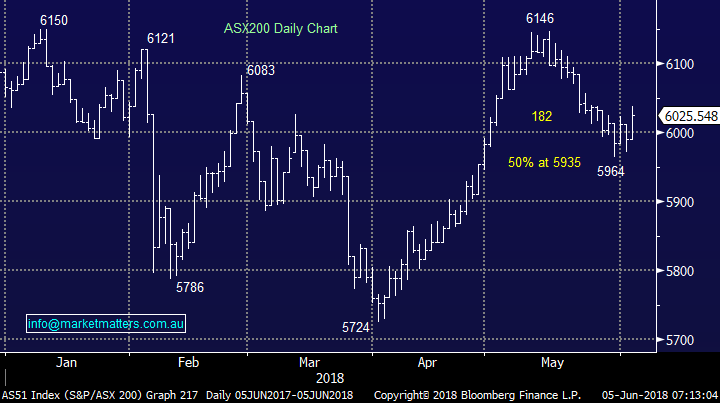 Overnight global market followed the positive lead from the futures markets with the Dow +178-points and the EuroStoxx +0.5%. However the futures are unfortunately pointing to a weak open for the local market down ~20-points / 0.4% with BHP a likely major influence closing down 40c in the US as it followed the oil price and overseas energy stocks lower, Crude oil has now fallen well over 10% from its May highs following Saudi Arabia’s indication of a ramp up in production moving forward – at MM we remain bearish the local energy sector targeting up to 10% further weakness for the likes of Origin Energy (ORG).