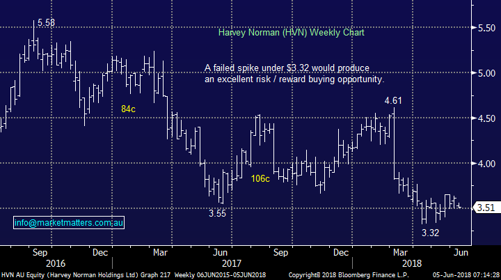 2. Harvey Norman (HVN) may look interesting below $3.30, or 6% lower.