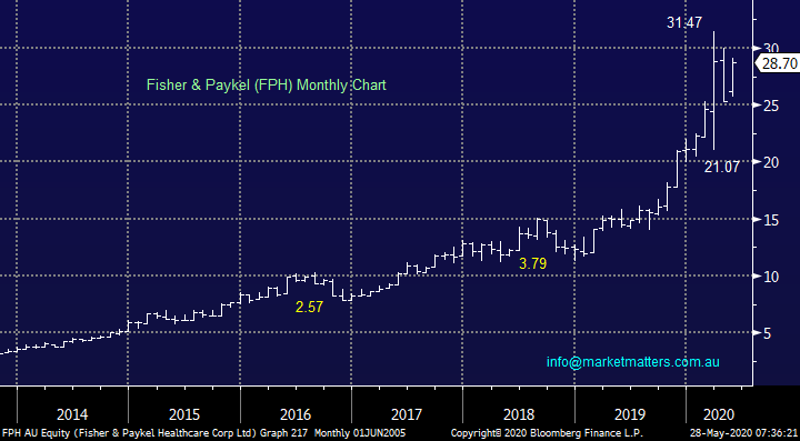 In a similar way to ResMed respiratory business FPH looks poised to make fresh all-time highs in the year ahead but the risk / reward is not particularly exciting at current levels. We are keen accumulators into weakness.