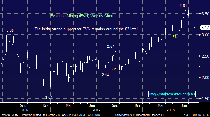 - Evolution Mining (EVN) – we have been stalking EVN for weeks looking for a pullback of ~50c, similar to that in Q3 of 2017 i.e. we are potential buyers between $3 and $3.10.