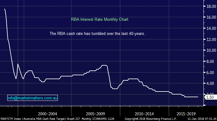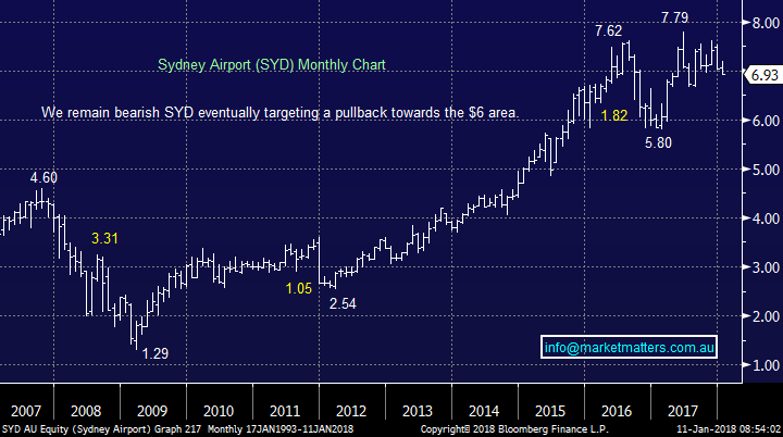 We’ve been bullish interest rates for over a year and subsequently bearish the likes of Transurban (TCL) and Sydney Airports (SYD). This call looked great in 2016/7 as they both fell well over 20% but they then rallied to fresh recent highs along with the strong year for stocks, plus reflecting that they are indeed solid companies.